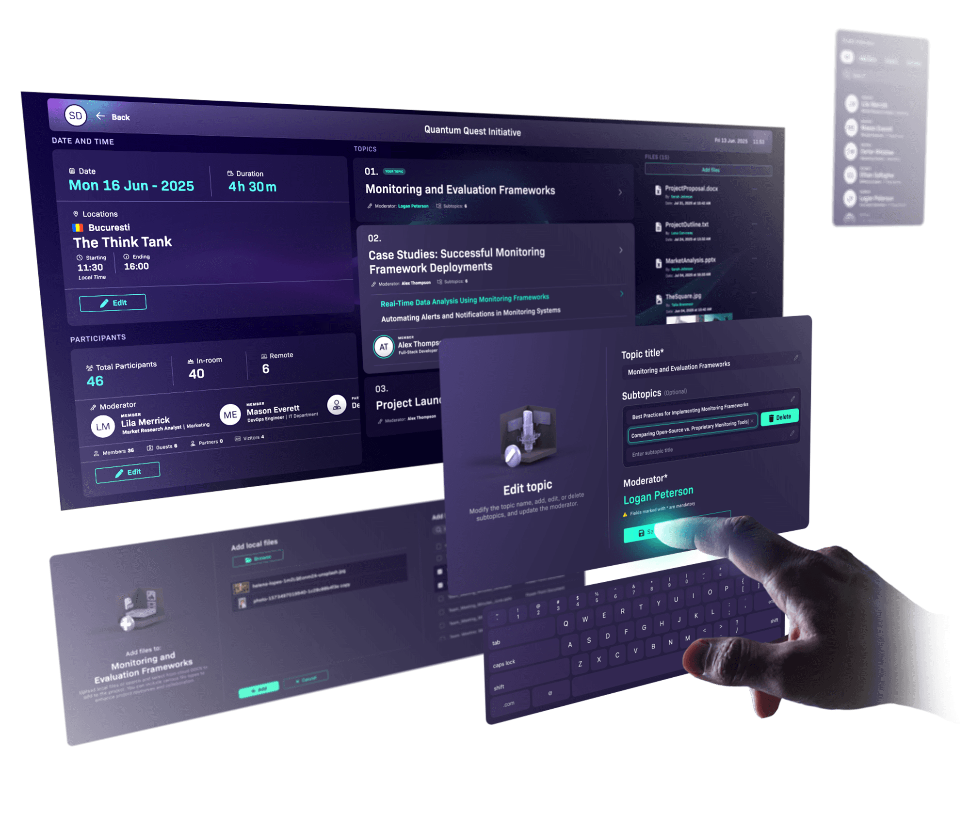 This dedicated workspace empowers each topic moderator to design their own agenda, structure their content, and upload all supporting materials, documents, images, and videos, ready for seamless delivery during the live session.